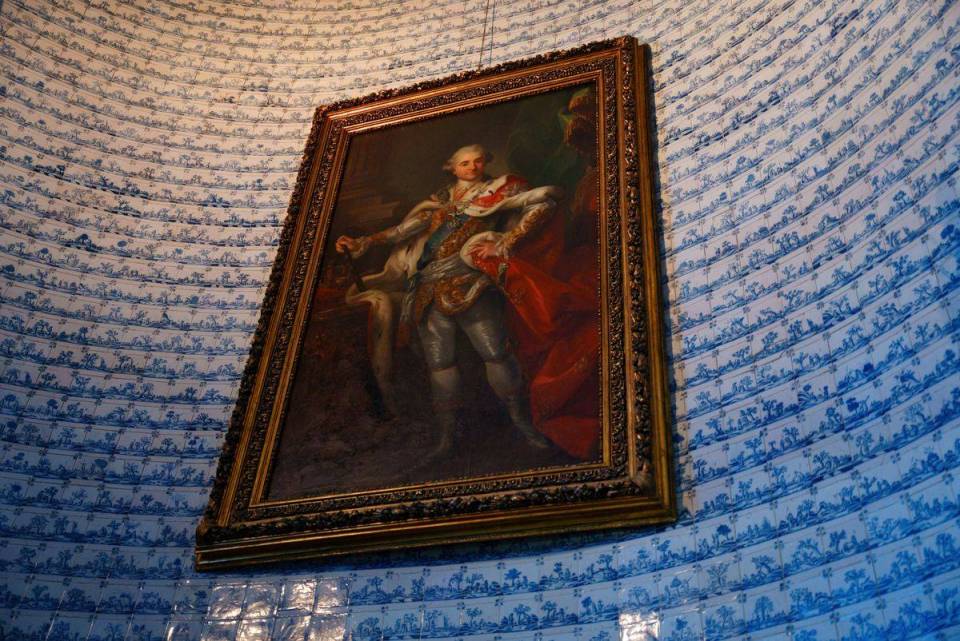 Wnętrza Nieborowa kryją też prawdziwe perły sztuki. Jednym z najbardziej urzekających pomieszczeń jest główna klatka schodowa – przestrzeń o niezwykłej urodzie i wyjątkowej historii. Wybudowana przez Michała Kazimierza Ogińskiego w latach 1766–1768, stanowi przykład mistrzowskiego połączenia architektury z dekoracją artystyczną. Jej ściany i podesty pokryto kobaltowymi płytkami ceramicznymi pochodzącymi z holenderskiej manufaktury w Harlingen, filii słynnego Delft. Kafelki, datowane na około 1700 rok, zdobią setki drobnych scenek z życia wsi holenderskie - malowane ręcznie błękitnym kobaltem na mlecznym tle. To niezwykły przykład XVIII-wiecznej mody na holenderską ceramikę, która w Polsce była symbolem luksusu i znajomości europejskich trendów.
