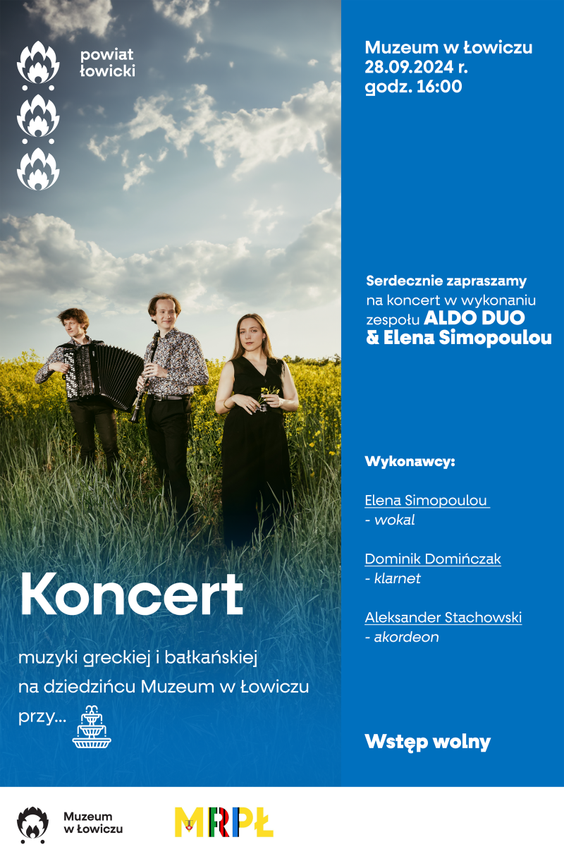 Powiat łowicki serdecznie zaprasza na koncert muzyki greckiej i bałkańskiej na dziedzińcu Muzeum w Łowiczu przy fontannie.