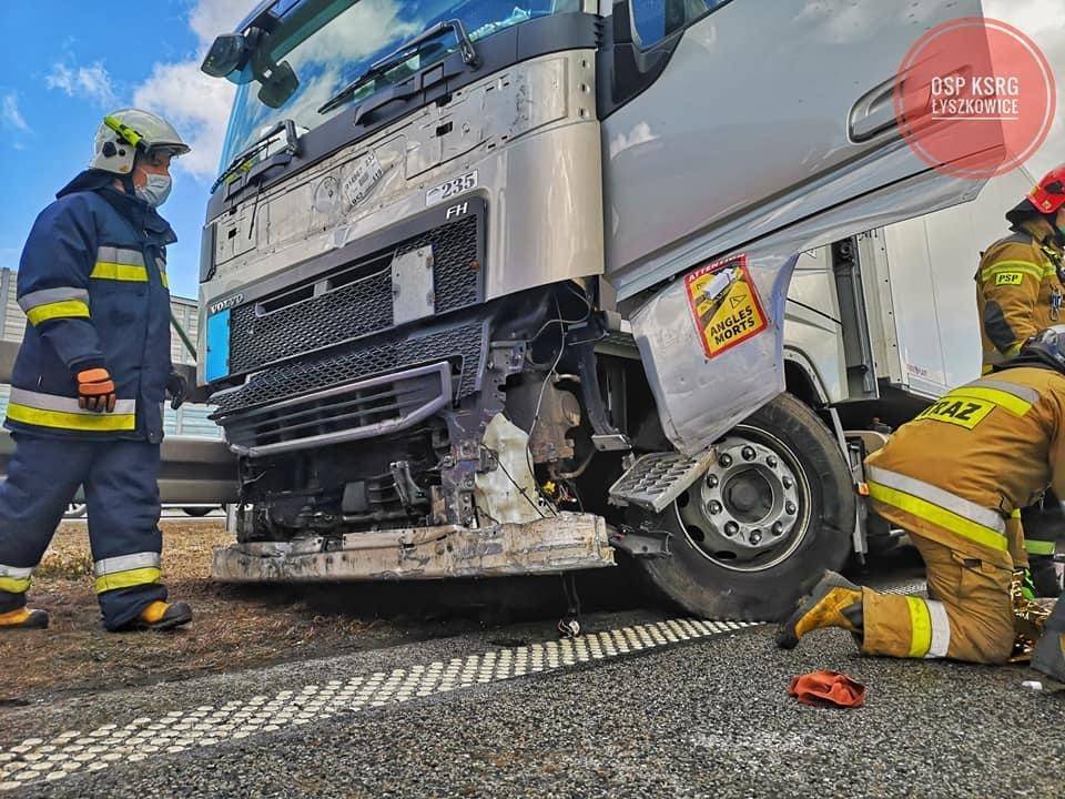 - Kierowca jadący pojazdem ciężarowym doznał ataku padaczki, przez co jadąc pasem w stronę Poznania uderzył w bariery energochłonne, przebił je a następnie zatrzymał się na pasie zieleni w stronę Warszawy - relacjonują druhowie z OSP Łyszkowice.