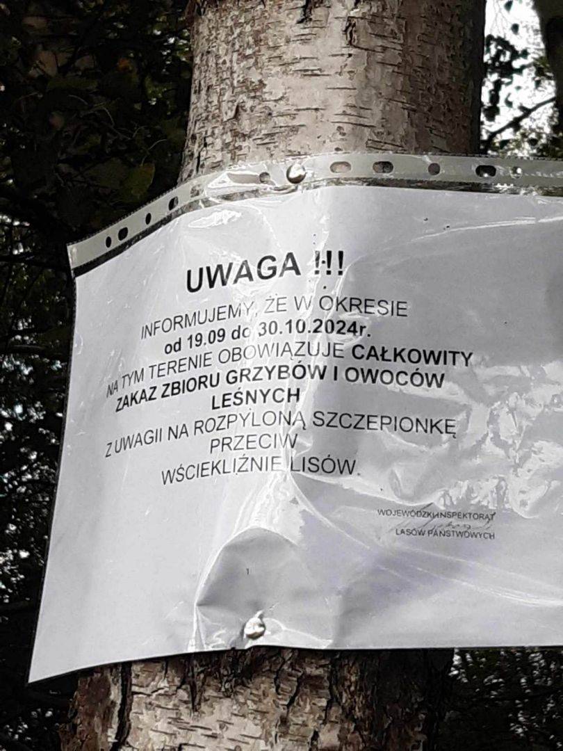 "Informujemy, że w okresie od 19.09.2024 do 30.10.2024 w tym terenie obowiązuje całkowity zakaz zbioru grzybów i owoców leśnych z uwagi na rozpyloną szczepionkę przeciwko wściekliźnie lisów"