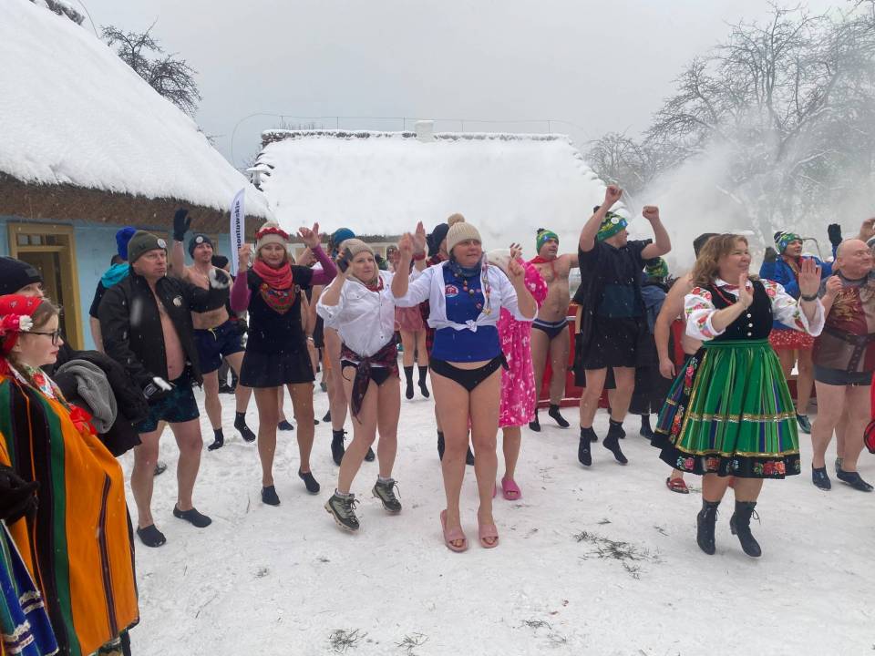Lodowe kąpiele przeplatały się ze wspólnymi śpiewami i zabawą przy muzyce ludowej, która idealnie wpisała się w klimat miejsca. Dźwięki regionalnych melodii niosły się po skansenie, tworząc niepowtarzalną atmosferę i przypominając, że folklor nie jest reliktem przeszłości, lecz żywą, radosną częścią lokalnej tożsamości.