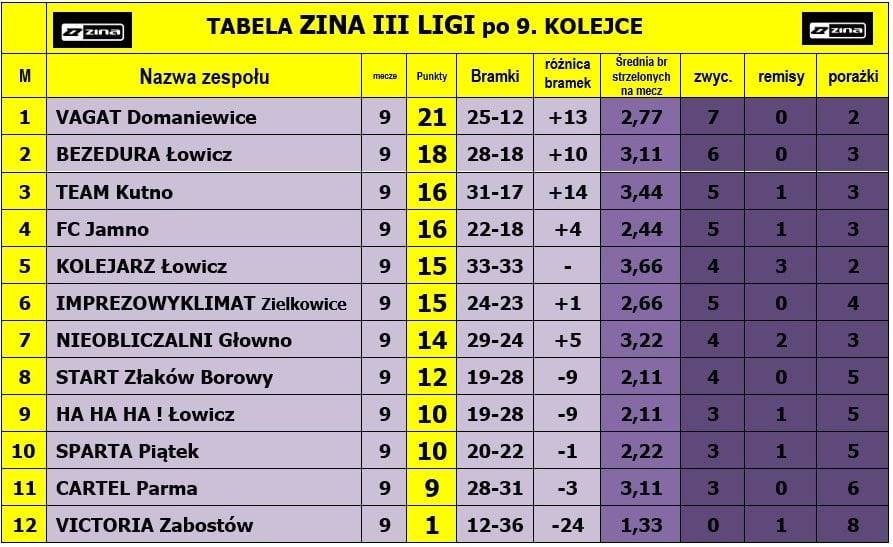 Szanse na awans ma aż siedem zespołów. Z Zina III ligą pożegnała się już Victoria Zabostów. W przyszły weekend zapowiada się kilka ciekawych pojedynków (Sparta Piątek - Team Kutno, Bezedura - Imprezowyklimat, Nieobliczalni - FC Jamno w sobotę, oraz Bezedura - Kolejarz i Imprezowyklimat-Vagat w niedzielę).