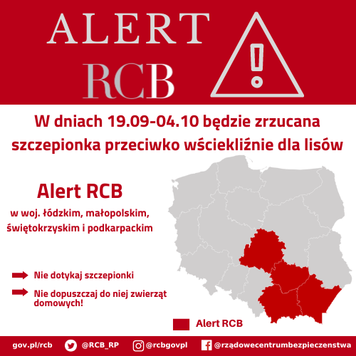 W związku z planowaną akcją szczepienia lisów przeciwko wściekliźnie, do odbiorców w województwach: łódzkim, małopolskim, świętokrzyskim i podkarpackim wysłano Alert RCB o treści: