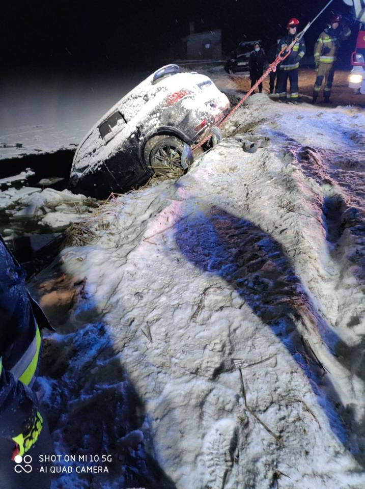 Ratownicy zabezpieczyli miejsce zdarzenia, udzielili pomocy zziębniętemu kierowcy a następnie podjęli próbę wyciągnięcia samochodu. Niestety, biorąc pod uwagę panujące warunki, wyciągnięcie Porsche okazało się niemożliwe. Udało się to dopiero przy pomocy ciężkiego samochodu ratownictwa technicznego ze Strykowa.