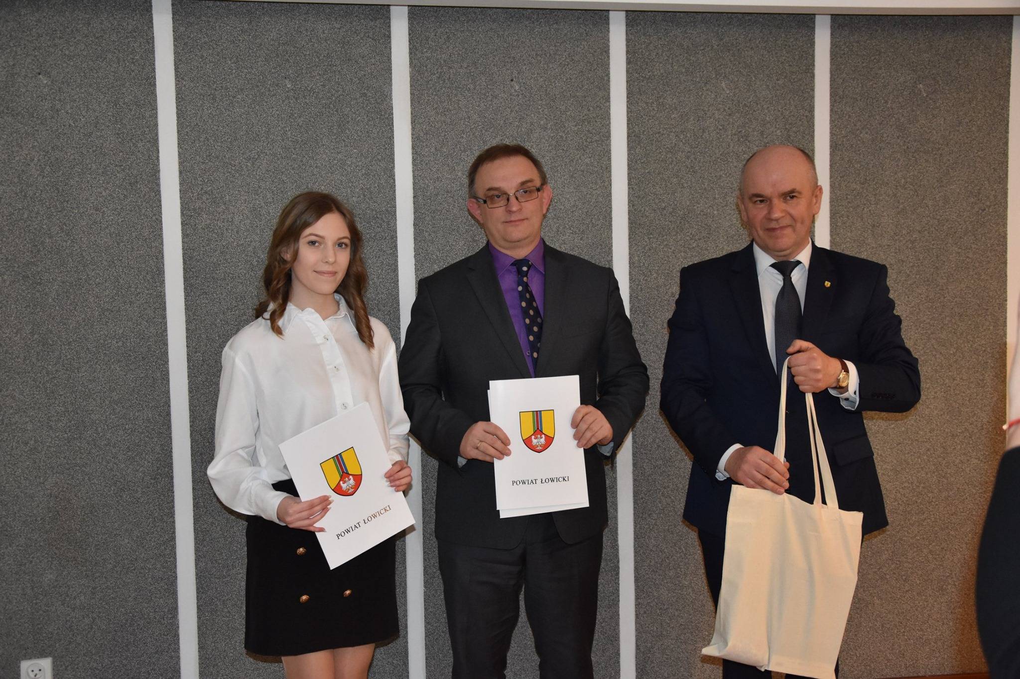 Podczas XX Sesji Rady Powiatu Łowickiego Starosta Łowicki - Marcin Kosiorek oraz Przewodniczący Rady Powiatu Łowickiego Marek Jędrzejczak wręczyli listy gratulacyjne oraz upominki stypendystom Prezesa Rady Ministrów ze szkół prowadzonych przez Powiat Łowicki.