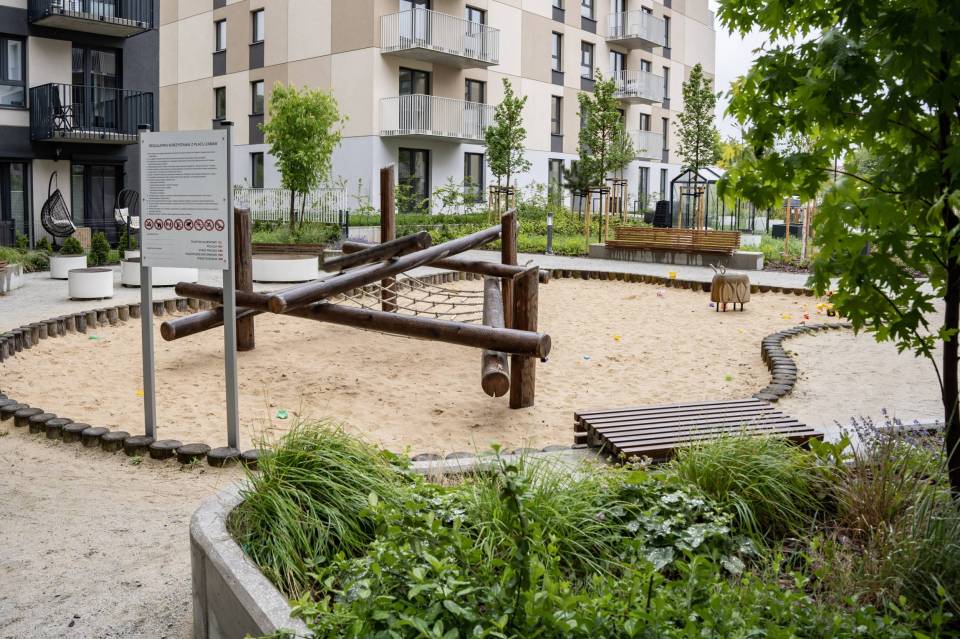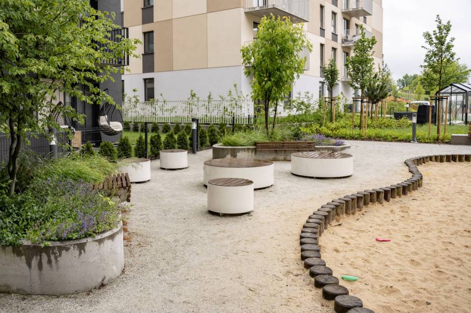 Firma jest wykonawcą prac m.in. na nowym osiedlu powstającym na łódzkim Widzewie, przy ul. Wałowej. Między blokami, gdzie większość mieszkań jest jeszcze pustych już zielenią się trawniki, rosną drzewa, są gotowe łąki kwietne. Droga pożarowa jest wykonana z siatki, między którą również rośnie trawa. Choć wokół jeszcze trwają prace ziemne, ogródek już jest gotowy. Na najmłodszych czeka plac zabaw.