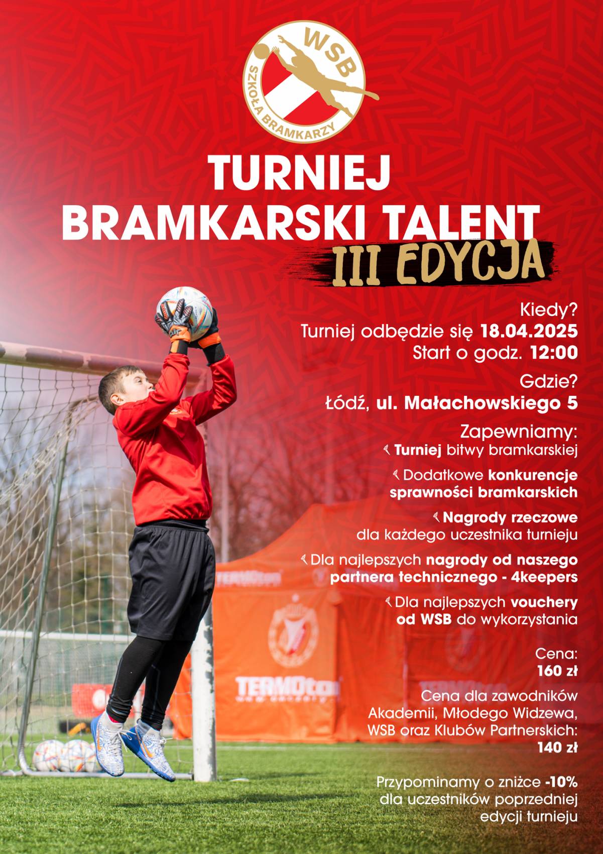 Trzecia edycja turnieju Bramkarski Talent obędzie się w piątek, 18 kwietnia o godz. 12:00 w ośrodku przy ul. Małachowskiego w Łodzi. Cena regularna wynosi 160 złotych, a dla golkiperów Akademii Widzewa, Młodego Widzewa, Widzewskiej Szkoły Bramkarskiej oraz Klubów Partnerskich - 140 złotych. Przypominamy również o zniżce -10% dla uczestników poprzedniego wydarzenia.