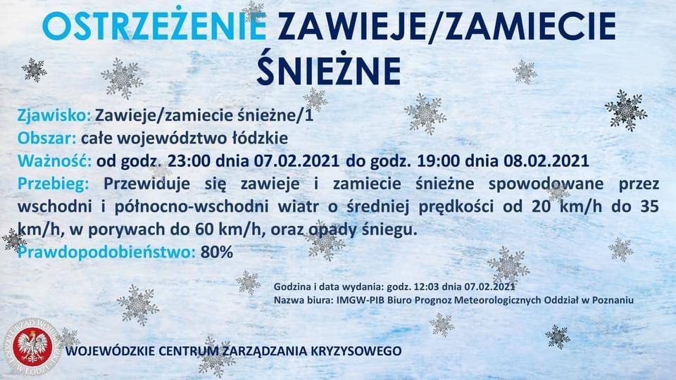 Meteorolodzy przewidują, że mogą wystąpić zawieje i zamiecie śnieżne spowodowane przez wschodni i północno-wschodni wiatr o średniej prędkości od 20 km/h do 35 km/h, w porywach do 60 km/h, oraz opady śniegu.