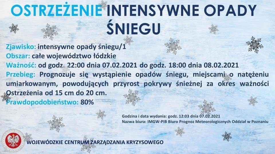 Jak czytamy w komunikatach Biura Prognoz Meteorologicznych Oddział w Poznaniu, prognozuje się wystąpienie opadów śniegu, miejscami o natężeniu umiarkowanym, powodujących przyrost pokrywy śnieżnej za okres ważności Ostrzeżenia od 15 cm do 20 cm.