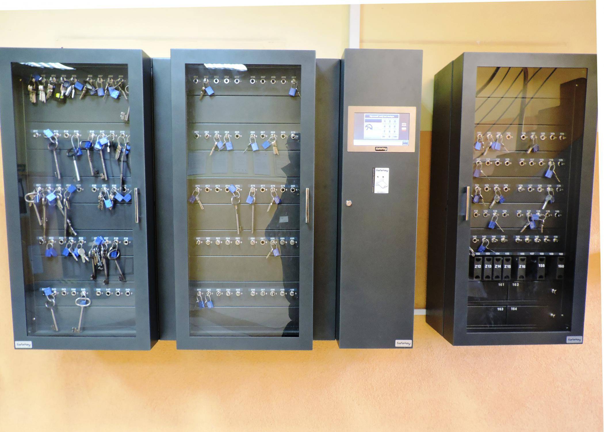 Elektroniczny depozytor kluczy działa od listopada ub. roku. Przy przyłożeniu do czytnika karty magnetycznej, w którą są wyposażeni funkcjonariusze, i pozytywnej weryfikacji takiej karty, drzwi jednej z trzech szaf otwierają się. W zależności od tego, do jakich kluczy mamy uprawnienia. Można pobrać klucz do pomieszczenia lub pomieszczeń, do których wcześniej zostały nadane uprawnienia. Pobór ułatwia dodatkowo migająca na niebiesko dioda przy każdym gnieździe, do którego przymocowane są poszczególne klucze. Jest ich około 150 łącznie. To pokazuje skalę dziennego ich dysponowania, gdy elektronicznego depozytora nie było. Przy okienku po ich odbiór lub zdawanie trzeba było odstać swoje, wypisać w „Książce wydanych kluczy specjalnych" kto i jaki klucz pobiera i podpisem kwitowało się odbiór. Teraz wszystko to zapisywane jest automatycznie przez system komputerowy. Trwa to kilka sekund. Użytkownik klucza, przed opuszczeniem jednostki, musi go zdać. Procedura jest podobna, jak podczas pobierania, tyle, że klucz wtyka się w przypisane i oznakowane wcześniej gniazdo. Przezroczyste drzwi szaf pozwalają, bez konieczności ich otwierania, stwierdzenie, czy po służbie brakuje jakiegoś klucza.