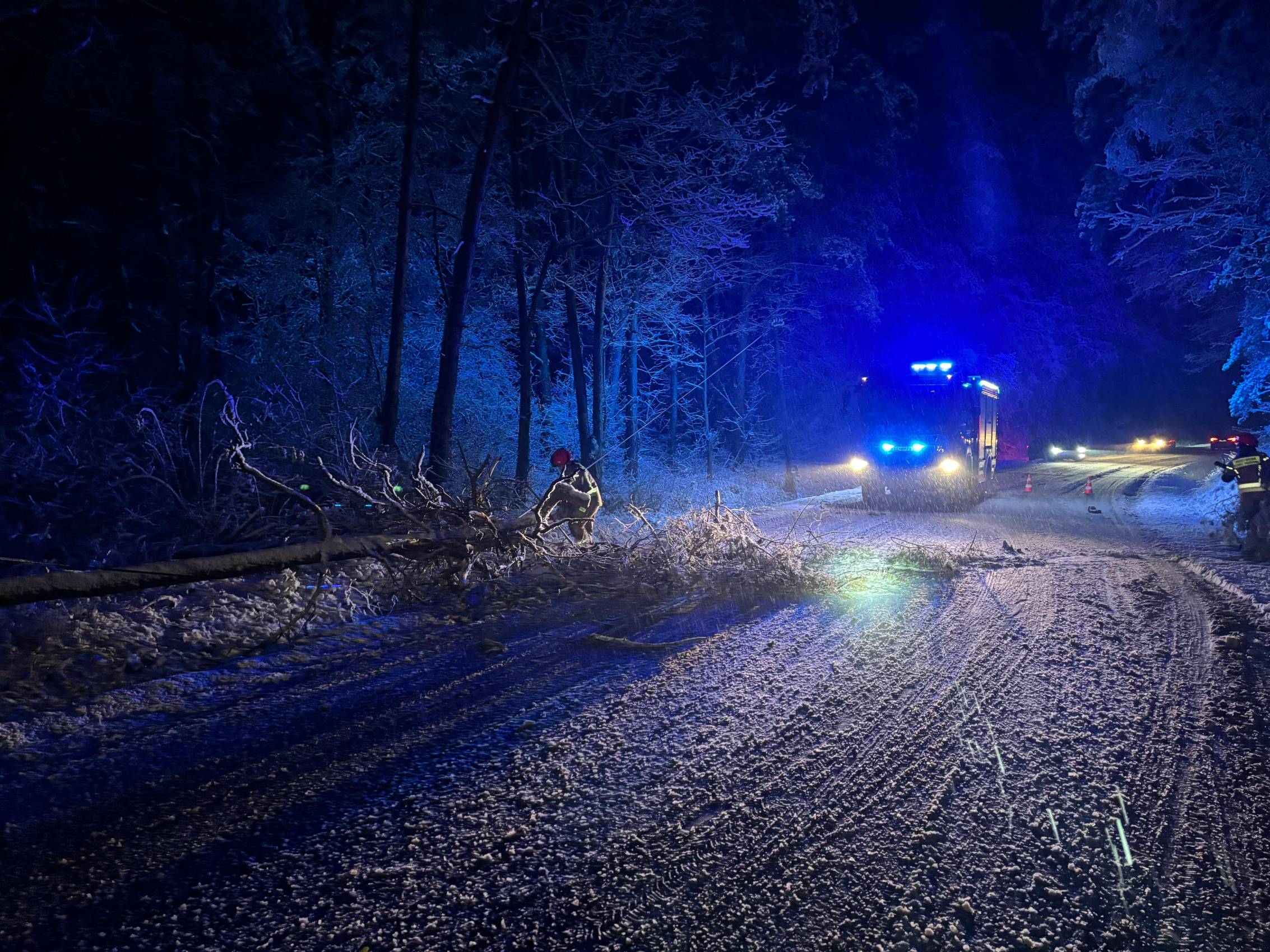 Służby apelują do mieszkańców o ostrożność, unikanie niepotrzebnych podróży oraz zgłaszanie wszelkich sytuacji stwarzających zagrożenie. Obfite opady, niska widoczność i połamane gałęzie sprawiają, że warunki na drogach pozostają wyjątkowo trudne.